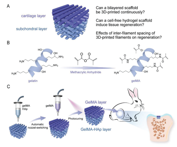 图1 一步法连续3D打印构建的双层支架的组成结构及其在骨软骨修复中的应用