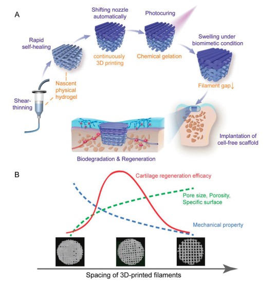 丁建东团队运用化学改性的明胶大单体gelMA水体系随温度降低呈现sol-gel转变的特征,并提出了“初生凝胶”的概念,即,在合适的改性程度、浓度、温度条件下,刚低于相转变点所形成的水凝胶具有显著的非牛顿流体行为,呈现强烈的剪切变稀和自修复能力,由此解决了挤出成型中方便挤出和保持塑型的两难问题,进一步将物理凝胶化和化学凝胶化相结合,获得了较为理想的交联明胶GelMA水凝胶多孔支架。调节3D打印的梁间距,制备了一系列双层多孔水凝胶支架。综合结合支架的力学性能、体外细胞迁移和增殖实验以及体内的兔关节软骨-软骨下骨的再生修复研究,发现在溶胀的水凝胶支架中,中等合适的孔隙能保证细胞的充分迁移、营养的充分输送并且提供必要的力学性能。优化条件下再生的关节软骨的微观结构呈现正常的组织学形态。