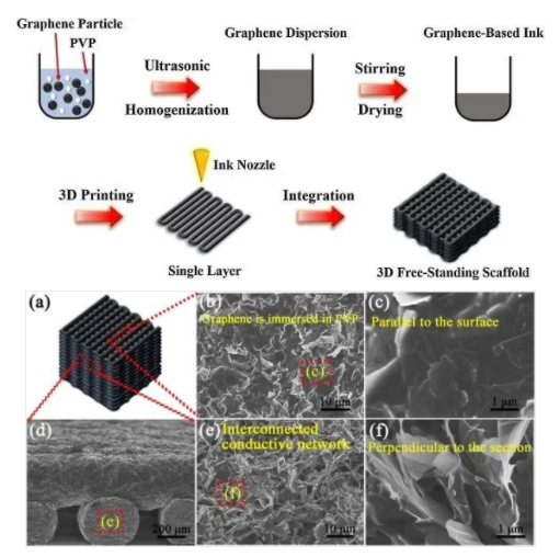 研究团队基于捷诺飞研发的生物 3D 打印机(Regenovo 3D bioprinter V2.0)制备了一种灵敏度可调的石墨烯支架,扫描电子显微镜(SEM)显示,石墨烯片分布均匀,并没发现明显的团聚。放大的区域显示,石墨烯片垂直于横截面分布并产生了互连的导电网络,可增加比表面积,提高目标气体的吸附率和电荷载流子的传输效率。