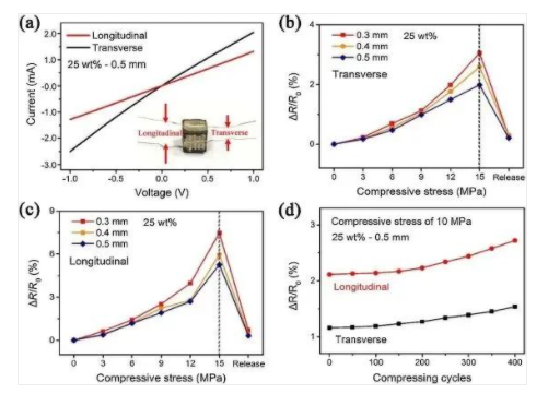 石墨烯片的重排和取向分布可以通过挤出过程的剪切作用获得,且所制备的石墨烯支架的电学性质在横向和纵向上显示出明显的差异。对此,研究人员接着探究了压缩对特定支架电阻的影响,该支架的直径为 0.5 mm,质量分数为 25%,在所有制备的样品中具有优异的机械性能。线性电流 - 电压曲线显示,当压缩应力作用于支架的横向方向时,电阻在 0-15 MPa 的范围内小范围地增加,并且相对电阻(ΔR/ R0)在去掉外力后基本上可以恢复到初始值。其中,在直径为 0.5 mm 的样品中可获得相对较小的值 1.86%。这些结果表明,石墨烯支架在不同方向上具有优异的机电稳定性。