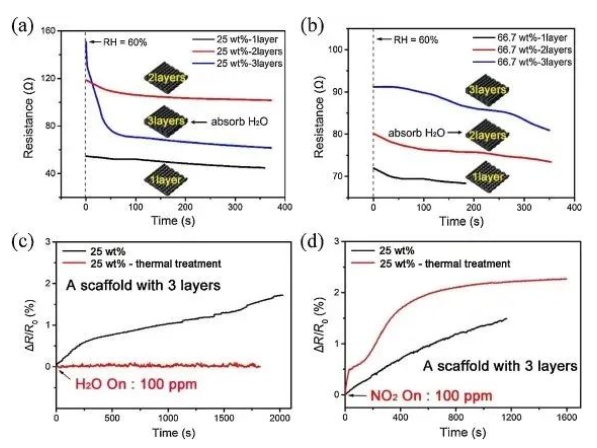 为了进一步研究石墨烯 / 聚乙烯吡咯烷酮(PVP)复合材料对 H2O 和 NO2 的吸附机理,研究人员对支架进行了热处理以去除 PVP 涂层,使支架由完全暴露的石墨烯片组成,产生松散的网络结构。实验结果显示,支架的电阻可实现对 100 ppm H2O 和 100 ppm NO2 的实时响应,相对电阻变化分别达到 2%和 2.5%。