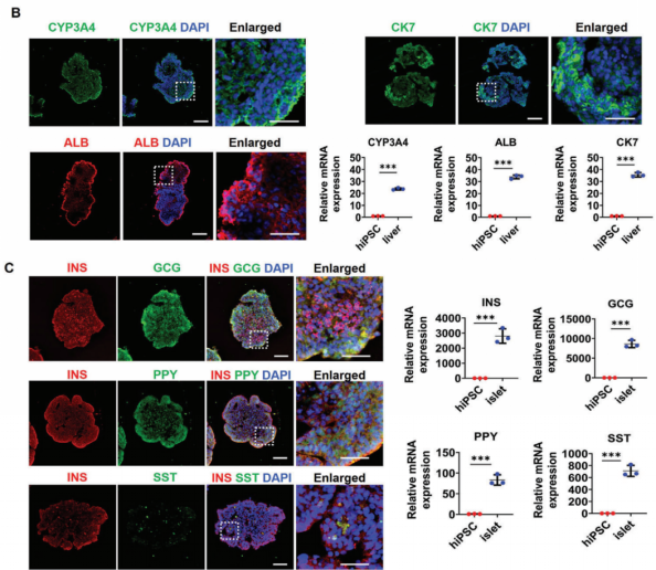 肝脏和胰岛类器官形成之后,研究人员采用免疫蛋白染色和RT-PCR对类器官的功能进行了验证(图2)。结果显示,在肝脏类器官中,P450标记物(CYP3A4)、成熟肝细胞(ALB)和胆管细胞(CK7)标记物高度表达,显示出肝脏类器官的细胞异质性;在胰岛类器官中,特异性标记物β-细胞(胰岛素,INS),α-细胞(胰高血糖素,GCG),γ-细胞(胰腺多肽,PPY),δ-细胞(生长抑素,SST)的表达验证了该研究中产生的异质性胰岛类器官包含四种内皮类型,类似于人胰岛结构。