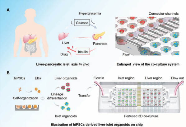 人体内葡萄糖稳态由多种组织协同调控,包括肝脏、胰岛、脂肪和肌肉等。其中肝脏和胰岛在维持正常血糖方面具有双重功能。在禁食状态下,胰岛α-细胞分泌胰高血糖素,促使肝脏中糖原分解产生肝糖,增加血液中葡萄糖水平;进食后,胰岛β-细胞分泌胰岛素促进葡萄糖进入肝脏合成肝糖原,从而调节血糖的稳态。二者协调作用的失衡往往导致血糖水平失调和代谢紊乱,如导致2型糖尿病(T2DM)的发生。现阶段针对T2DM的研究主要依赖于细胞或动物模型,缺乏多器官间的互作微环境,且存在显著的物种差异。