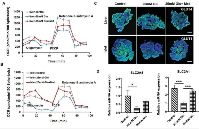 图5. 评估高血糖状态和二甲双胍治疗后胰岛-肝类器官系统的线粒体功能和葡萄糖转运能力