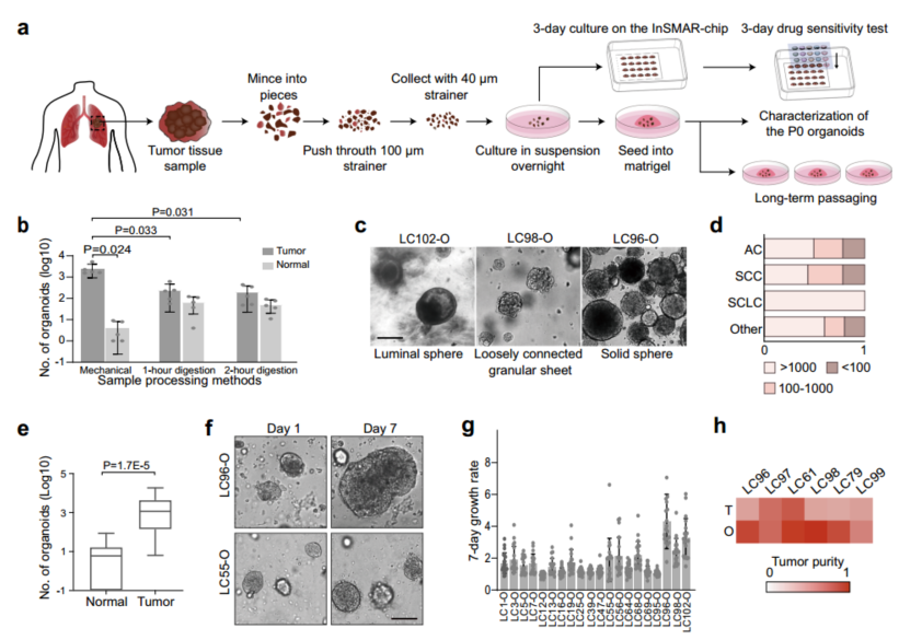 研究人员建立了一种有效的机械样品处理方法如图1(a)所示,并采用此方法处理了103例手术切除的肺癌组织样本(含71例腺癌、23例鳞状细胞癌、4例小细胞肺癌和5例其他类型肺癌)用于LCOs制备,结果显示类器官培养的成功率为79%。
