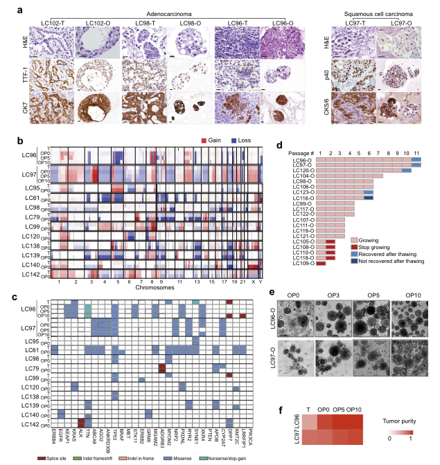 研究人员对LCOs进行H&E染色、免疫组化和全基因组测序分析。结果表明,所制备的LCOs保留了原肿瘤组织的组织学和遗传特征,在体外长期培养和传代后,均保持稳定。