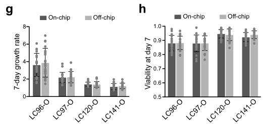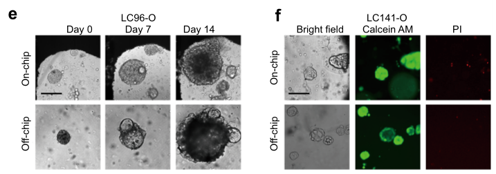 为了加快药物敏感性试验的进程,研究人员开发了一种InSMAR-chip,以取代传统的96孔微孔板,用于高通量培养LCOs并检测LCOs对纳升级药物的反应。研究人员首先验证了在芯片上培养的LCOs显示出与在传统微孔板中培养的LCOs相似的生长速度和生存能力,更重要的是,保持了亲代肿瘤组织的3D结构(图3)。