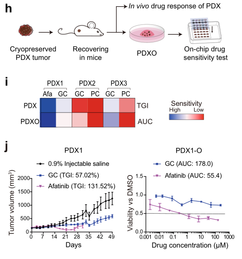 进一步,研究人员将PDX衍生的类器官PDXO,与基于小鼠的PDX模型进行药物敏感性试验比较。实验结果证明PDXOs的芯片药物反应与体内PDX结果一致(图4)。
