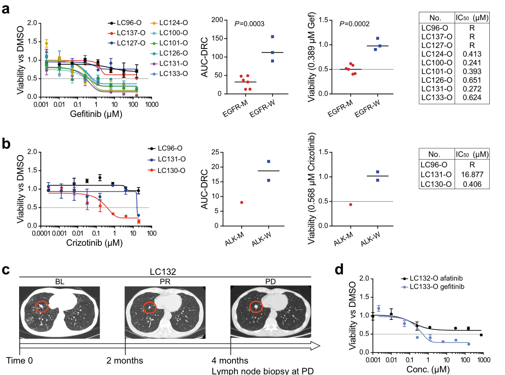 接下来,为了验证药物敏感试验是否可以重现患者对TKI治疗的反应。研究人员对两个患者(LC132-O和LC133-O)的药物治疗进行了追踪记录。结果显示,两名患者的肿瘤都在数月后出现了耐药性,并伴随着肿瘤转移。同时,LC132-O和LC133-O的芯片药敏试验产生了两条相差较大的剂量-反应曲线,其中LC132-O表现出更多的耐药性,与临床结果非常吻合。这些结果表明,基于LCOs的芯片药物筛选应用于个性化药物治疗的可行性。