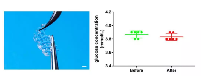 他们还利用水凝胶支架对葡萄糖溶液进行过滤,过滤后葡萄糖浓度仅降低了0.1mmol/L。这项测试表明多孔结构不会阻碍营养物质的通过。
