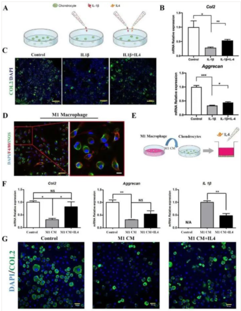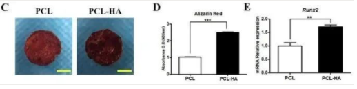 研究人员分别在促炎细胞因子 IL-1β、M1 巨噬细胞的刺激下研究了 IL-4 对软骨细胞的抗炎作用,结果表明,IL-4 可通过减少白细胞介素 1β(IL- 1β)、M1 巨噬细胞的负面作用来保护软骨细胞。茜素红染色结果表明,即使无成骨诱导培养基,PCL-HA 支架组的 OD 值也显著高于对照组。当在成骨诱导培养基中培养 C3H 细胞时,PCL-HA 支架组中成骨基因 Runx2 表达显著上调。这些结果均表明 PCL-HA 支架层具有促进细胞成骨分化的能力,有利于骨骼的再生。