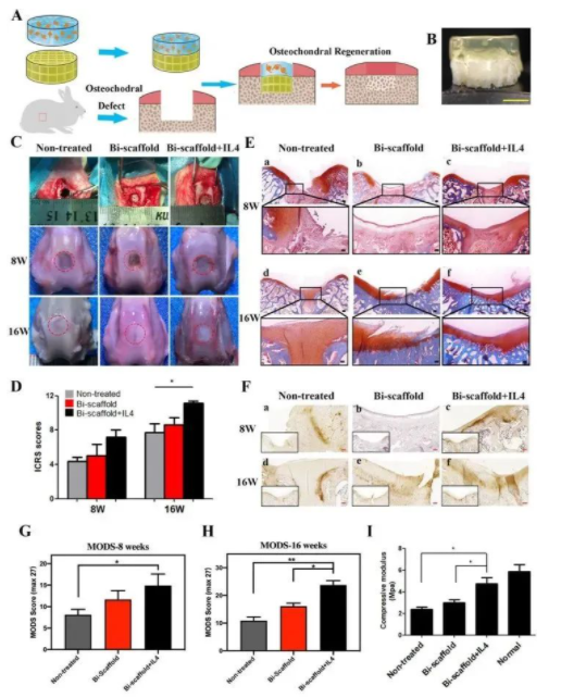 2020 年,浙江大学医学院邹晓晖老师和章淑芳老师团队在 Acta Biomaterialia 上发表了题为 An interleukin-4-loaded bi-layer 3D printed scaffold promotes osteochondral regeneration 的研究论文,通过联合 FDM 和 DLP 3D 打印技术制备了一种上层装有白介素 4(IL-4)的 GelMA 水凝胶,下层装有多孔聚己内酯和羟基磷灰石(PCL-HA)的双层支架,研究发现双层支架在体内和体外均具有良好的抗炎活性,显著增强了软骨修复和软骨下骨再生能力。