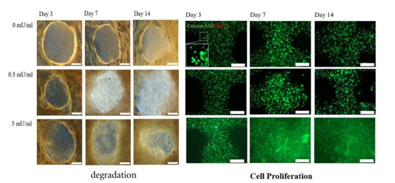 该生物墨水由1%海藻酸钠和3%(w/v)B型明胶组成,并添加0.5mU/ml和5mU/ml两种浓度的褐藻胶裂解酶。褐藻胶裂解酶常用于分析海藻多糖的结构。研究人员采用该添加了褐藻胶裂解酶的海藻酸钠基生物墨水通过捷诺飞自主研发的Bio-architect®Pro打印机打印出细胞负载水凝胶支架。支架体外培养14天后,含褐藻胶裂解酶的打印结构明显降解,支架内细胞密度随培养时间、裂解酶浓度增加而逐渐增加。