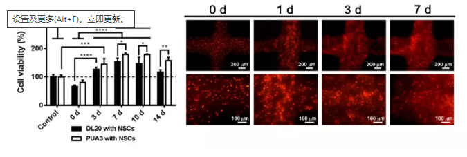 图3中对比了双响应聚氨酯材料(PUA3)和热敏聚氨酯材料(DL20)中神经干细胞(NSC)在14天的培养过程中的存活率和增殖率,观察可得双响应聚氨酯材料更有益于细胞的生长。