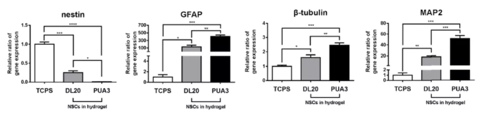 图4中展示了NSC细胞在不同支架中的基因表达情况,并且由接种细胞的TCPS支架作为对照组。结果显示,不同基因的增加/衰减程度均依照PUA3>DL20>TCPS的顺序排布,证实双响应聚氨酯材料更易于激发细胞的分化和蛋白表达等活动。