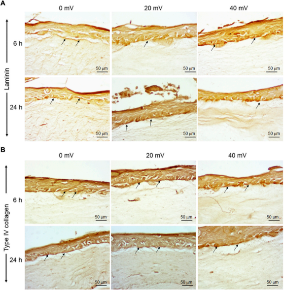 图2. 层粘连蛋白和IV型胶原蛋白在DHSE基底层的沉积。在组织工程和暴露于ES 6和24小时后,通过免疫组织化学评估层粘连蛋白和IV型胶原蛋白的存在。图A显示层粘连的组织。图B显示IV型胶原蛋白染色的组织。箭头指出了被染色的蛋白质(n = 4)。
