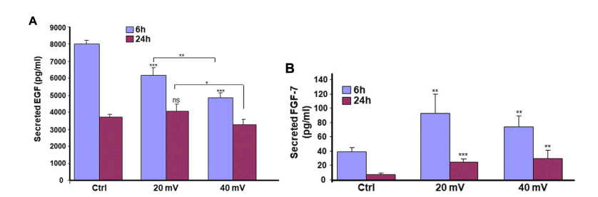 如图4A所示,对照组和试验组的EGF分泌量都随着时间的推移而减少。对照组在6小时时分泌量最高,但在24小时时所有三组的分泌量变得相似。此外,与20 mV/mm相比,在6小时内观察到的减少在40 mV/mm更明显。对FGF-7分泌的测量显示(图4B),在20 mV/mm和40 mV/mm下暴露6小时和24小时都有明显增加。