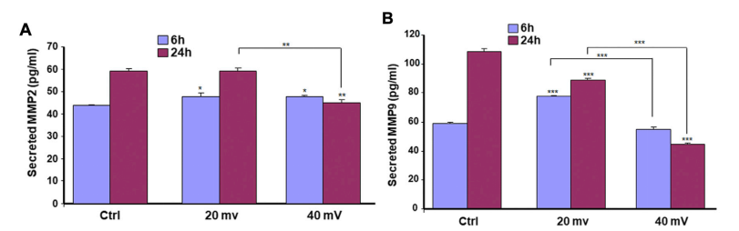 图5. ES调节糖尿病皮肤细胞的MMP2(A)和MMP9(B)的分泌。DHSE暴露于20或40 mV/mm的ES中6和24小时,每个暴露期结束后,立即用培养液测量MMP2和MMP9的水平。结果表示为三个不同实验的一式三份测定的平均值±SD。(ns),不显著。*P˂ 0.05, **P˂ 0.01, ***P˂ 0.001。自由星号指的是ES暴露与未暴露(Ctrl)组织比较时的统计学差异。带星号的条形图表示不同强度的ES的比较。