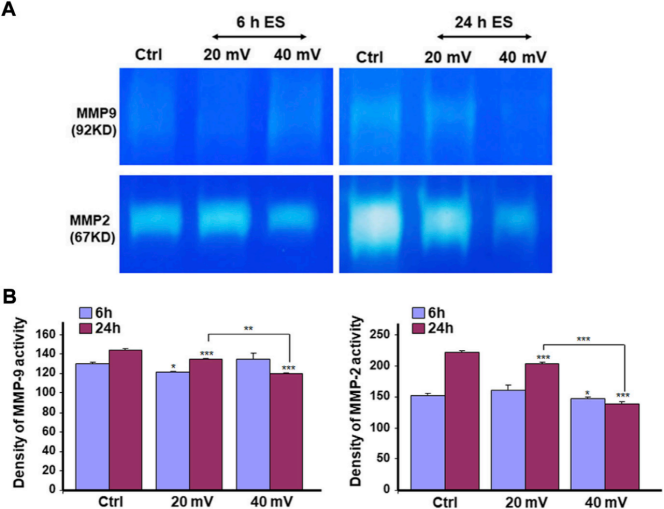 图6. ES降低了MMP2(A)和MMP9(B)的蛋白水解活性。DHSE暴露于20或40 mV/mm的ES中6和24小时。在每个暴露期结束后,立即用培养基来评估明胶消化的情况,使用酶谱分析。对三个实验的代表性凝胶进行拍照和展示。使用ImageJ分析进行定量测量。在ES暴露和未暴露的条件下,*P˂ 0.05,**P˂ 0.01。