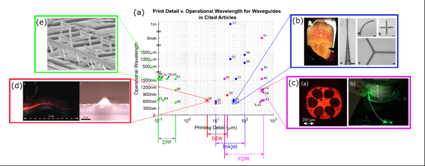 根据不同类别的光子和光学元件进行介绍,如图2显示了使用不同打印技术创建的跨光学(和相邻)波长的3D打印波导的示例和有前景的应用。